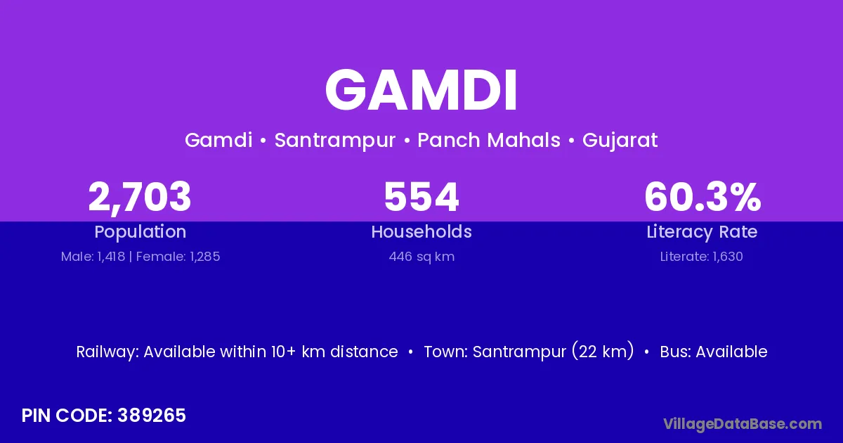 Jhalod (12 km) is the nearest town to Gamdi village for major economic activities and is located approximately 12 km away.