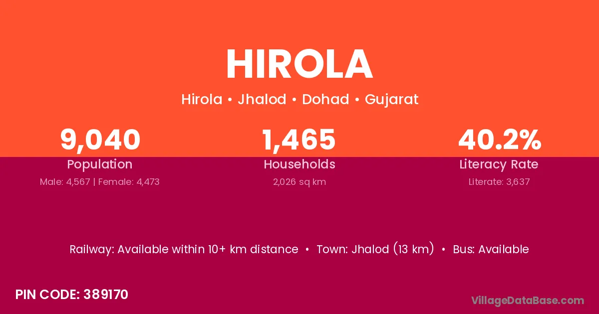Jhalod (13 km) is the nearest town to Hirola village for major economic activities and is located approximately 13 km away.
