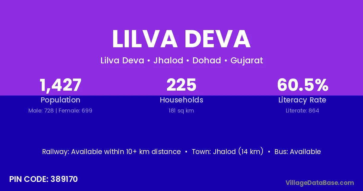 Jhalod (14 km) is the nearest town to Lilva Deva village for major economic activities and is located approximately 14 km away.