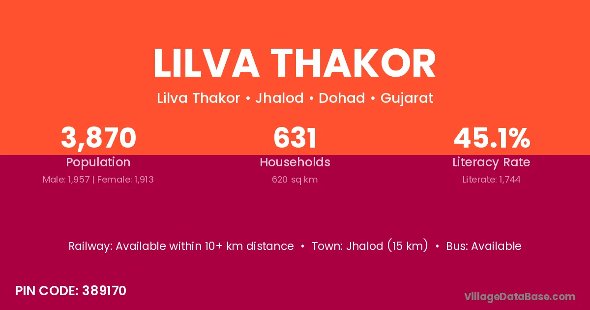Jhalod (15 km) is the nearest town to Lilva Thakor village for major economic activities and is located approximately 15 km away.
