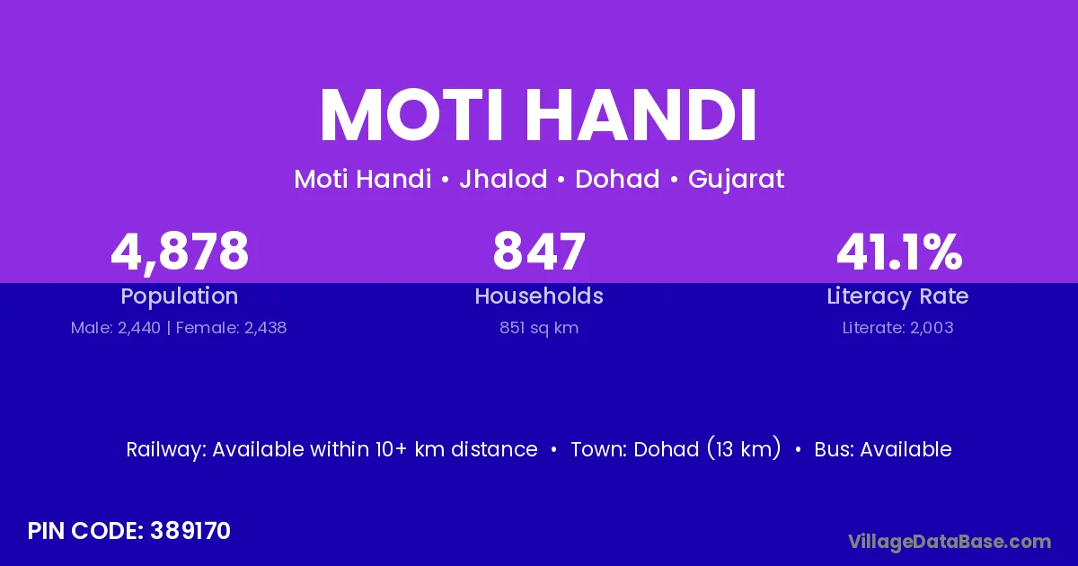 Dohad (13 km) is the nearest town to Moti Handi village for major economic activities and is located approximately 13 km away.