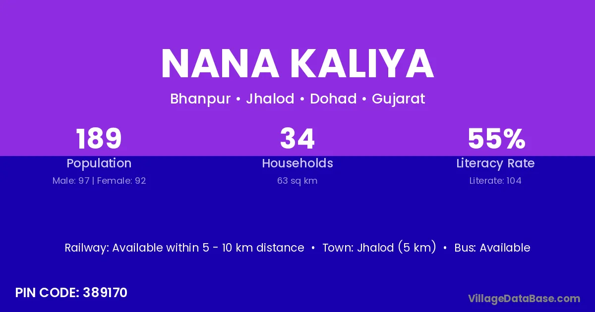 Jhalod (5 km) is the nearest town to Nana Kaliya village for major economic activities and is located approximately 5 km away.