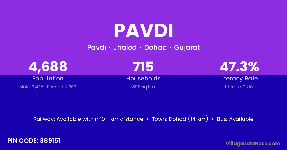 Dohad (14 km) is the nearest town to Pavdi village for major economic activities and is located approximately 14 km away.