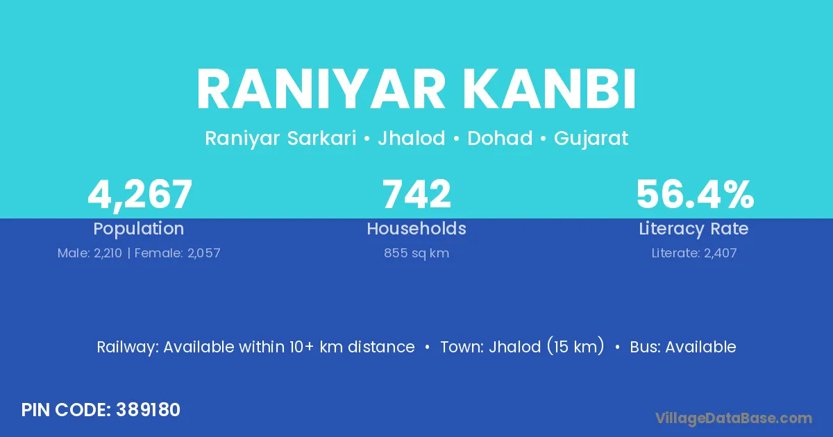 Jhalod (15 km) is the nearest town to Raniyar Kanbi village for major economic activities and is located approximately 15 km away.