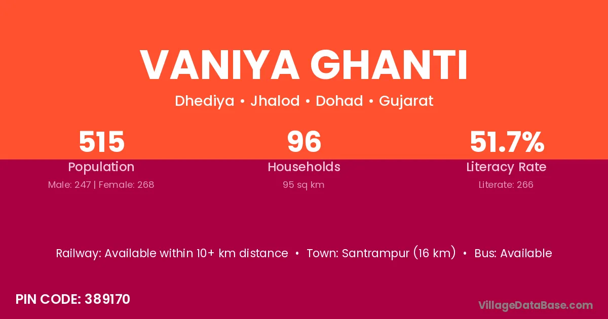 Vaniya Ghanti village has a total population of 515 people, of which 247 are males and 268 are females.