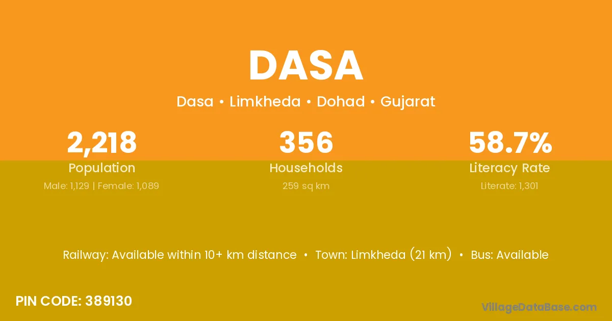 Limkheda (21 km) is the nearest town to Dasa village for major economic activities and is located approximately 21 km away.