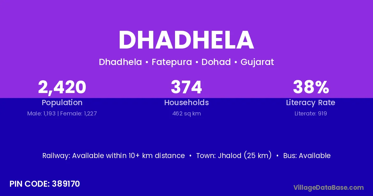 Limkheda (10 km) is the nearest town to Dhadhela village for major economic activities and is located approximately 10 km away.