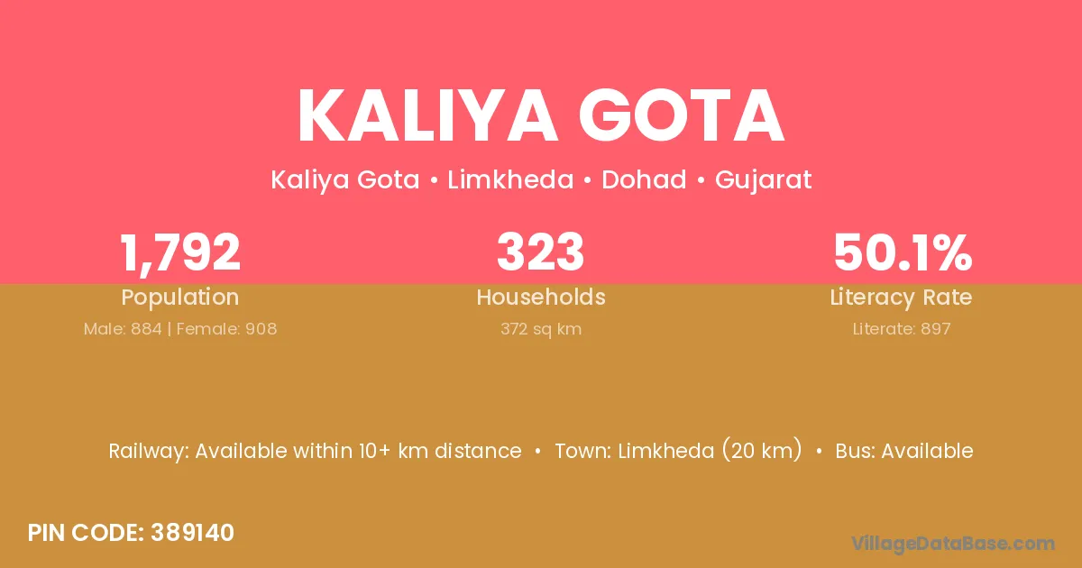 Limkheda (20 km) is the nearest town to Kaliya Gota village for major economic activities and is located approximately 20 km away.