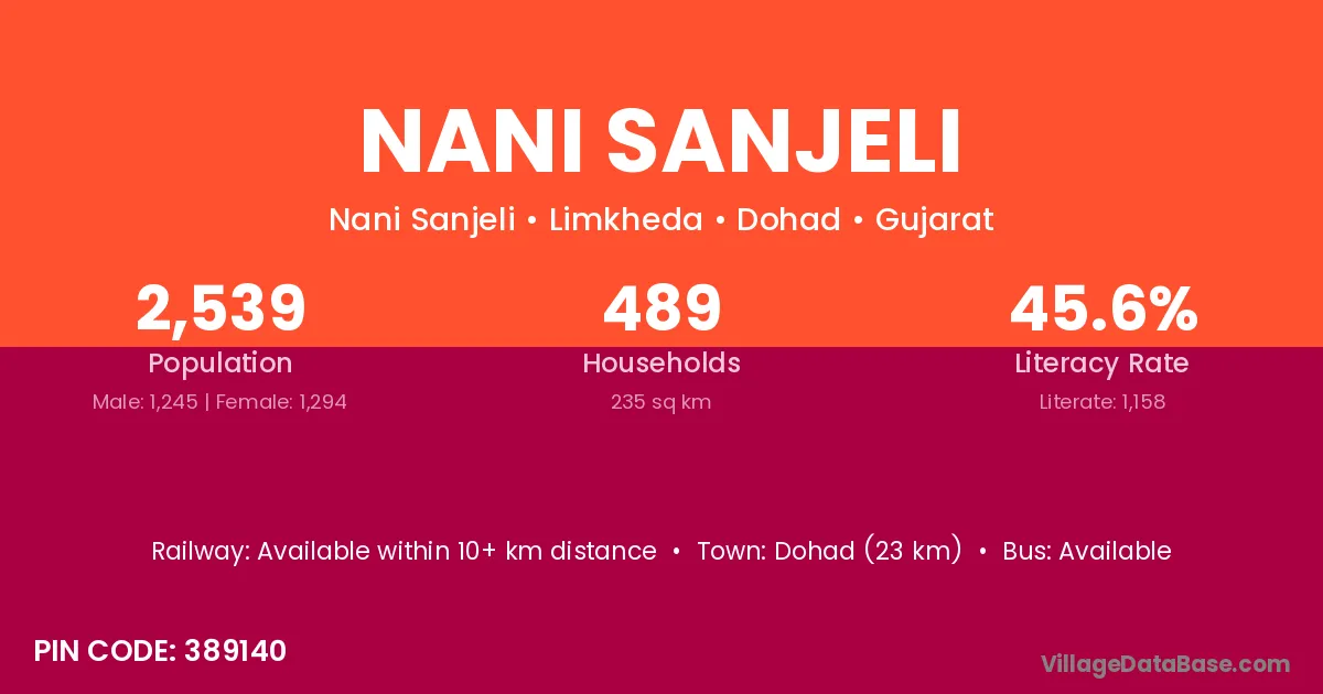 Dohad (23 km) is the nearest town to Nani Sanjeli village for major economic activities and is located approximately 23 km away.