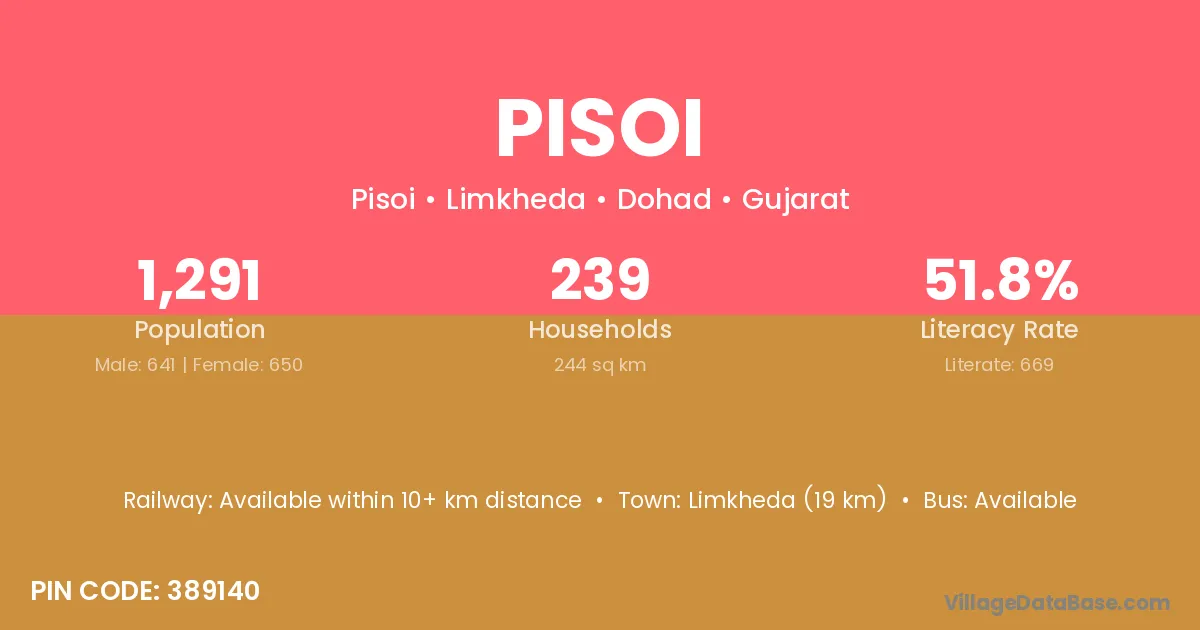 Limkheda (19 km) is the nearest town to Pisoi village for major economic activities and is located approximately 19 km away.