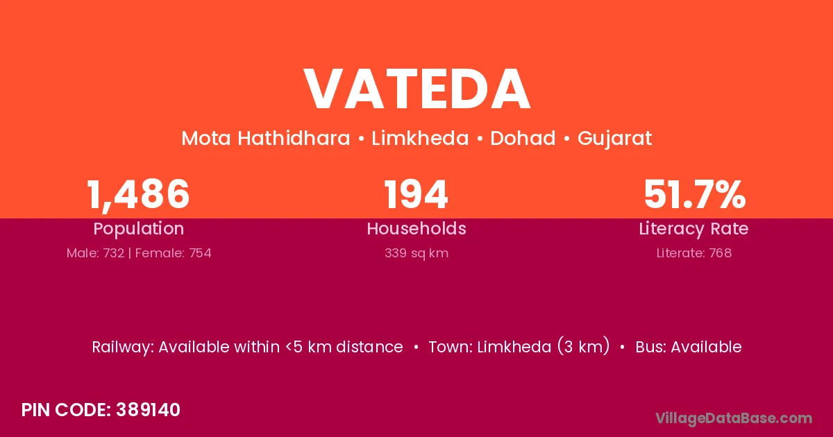 Limkheda (3 km) is the nearest town to Vateda village for major economic activities and is located approximately 3 km away.