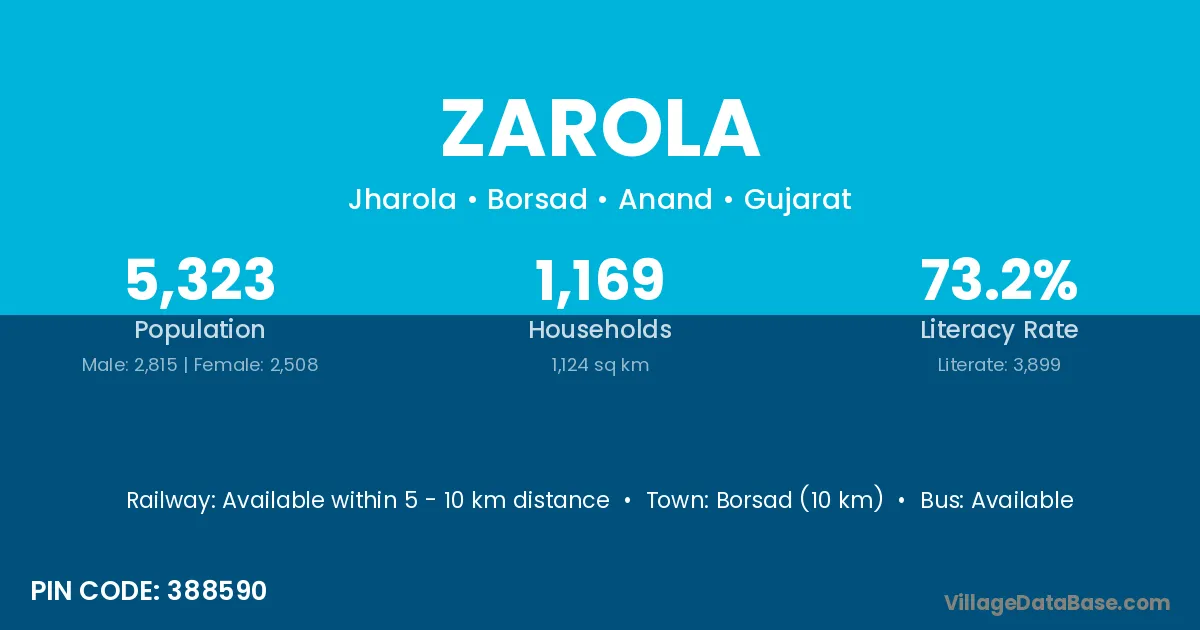 Limkheda (16 km) is the nearest town to Zarola village for major economic activities and is located approximately 16 km away.