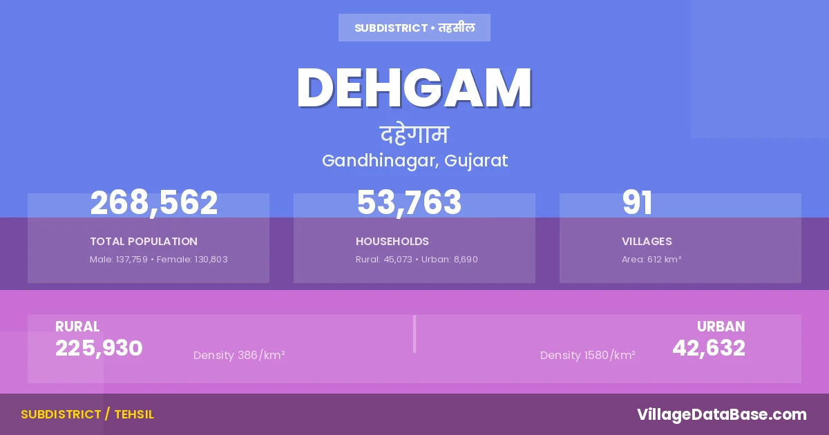 According to the 2011 census The total area of Dehgam Taluka is 612 km², with a population of 268562 people. The population density is 439 inhabitants per square kilometre, and there are approximately 53763 houses in the sub district.