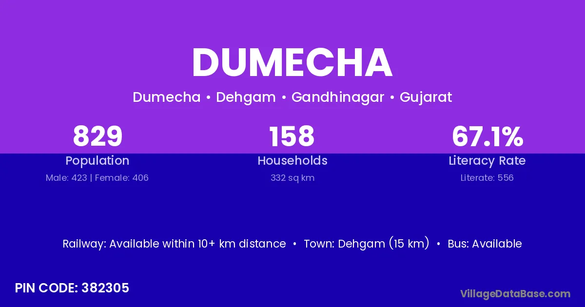 Dehgam (15 km) is the nearest town to Dumecha village for major economic activities and is located approximately 15 km away.
