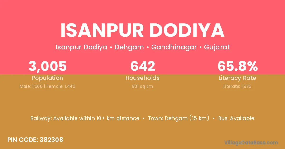 Dehgam (15 km) is the nearest town to Isanpur Dodiya village for major economic activities and is located approximately 15 km away.