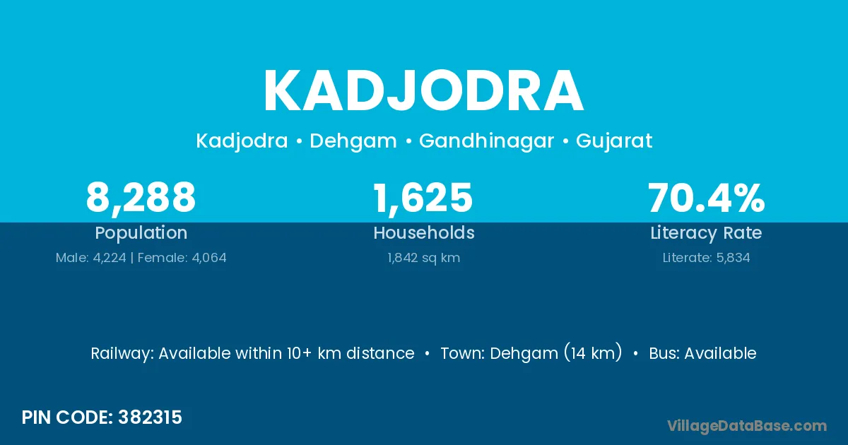 Dehgam (14 km) is the nearest town to Kadjodra village for major economic activities and is located approximately 14 km away.