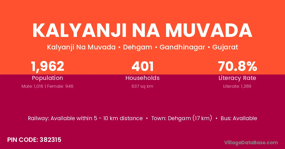 Dehgam (17 km) is the nearest town to Kalyanji Na Muvada village for major economic activities and is located approximately 17 km away.
