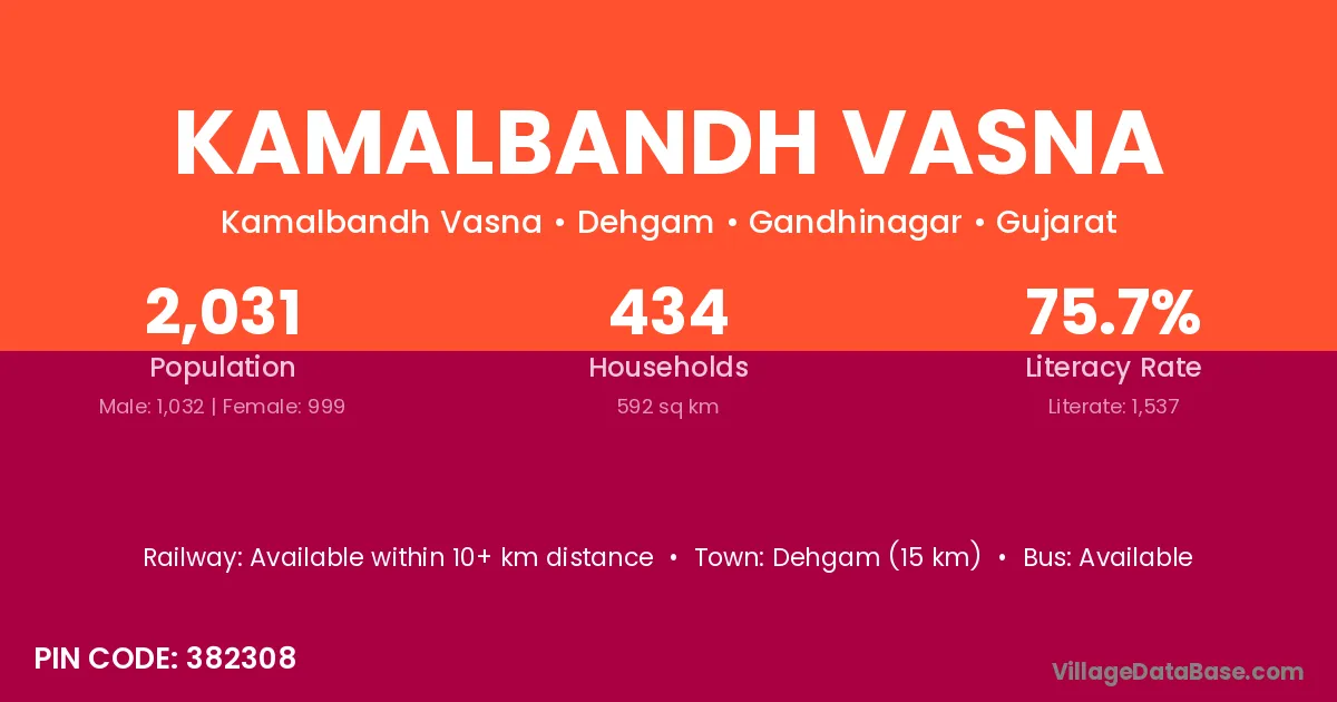 Dehgam (15 km) is the nearest town to Kamalbandh Vasna village for major economic activities and is located approximately 15 km away.