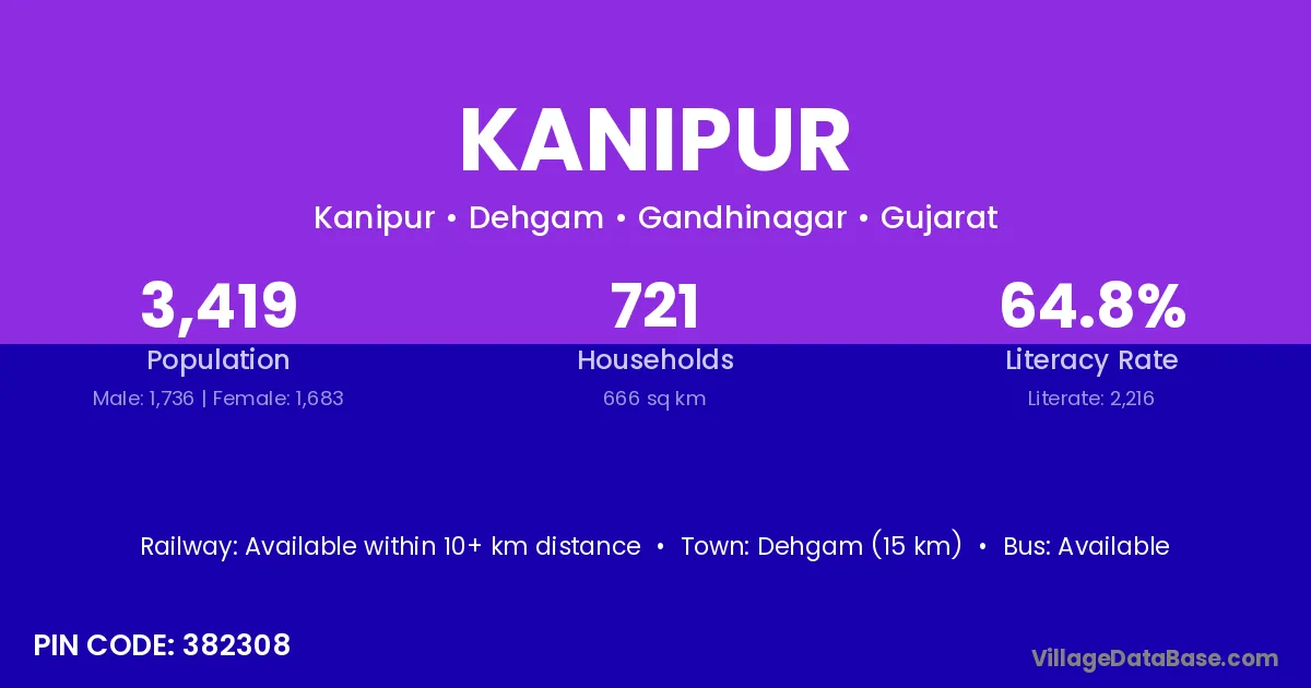 Dehgam (15 km) is the nearest town to Kanipur village for major economic activities and is located approximately 15 km away.