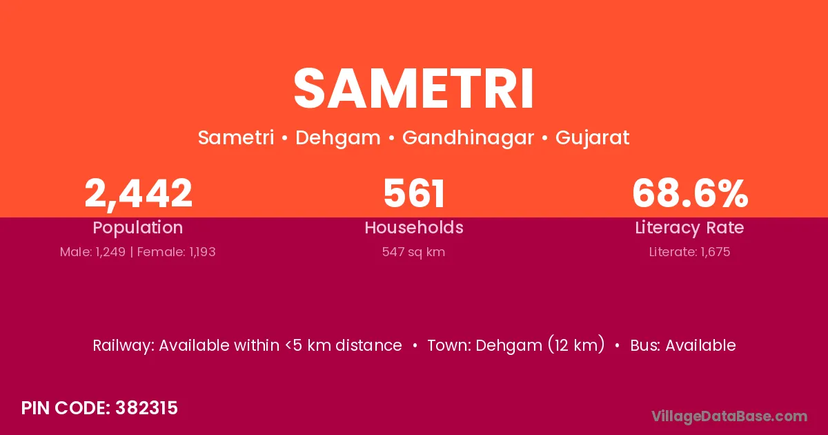Dehgam (12 km) is the nearest town to Sametri village for major economic activities and is located approximately 12 km away.