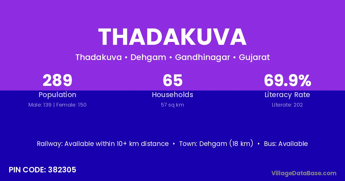 Dehgam (18 km) is the nearest town to Thadakuva village for major economic activities and is located approximately 18 km away.