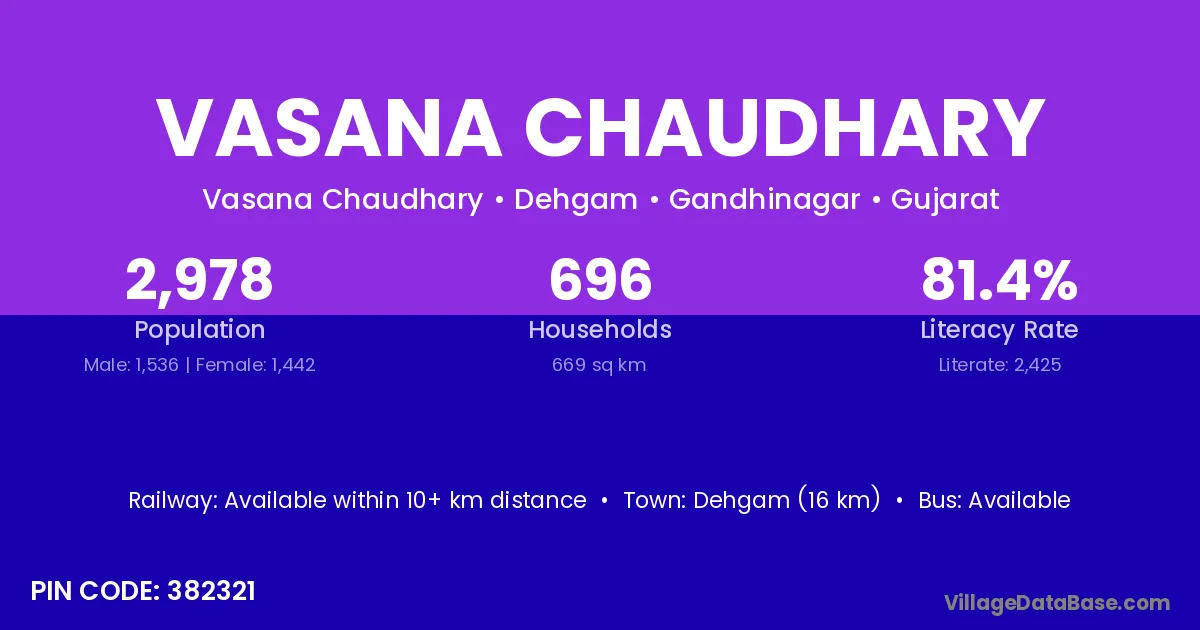 Dehgam (16 km) is the nearest town to Vasana Chaudhary village for major economic activities and is located approximately 16 km away.