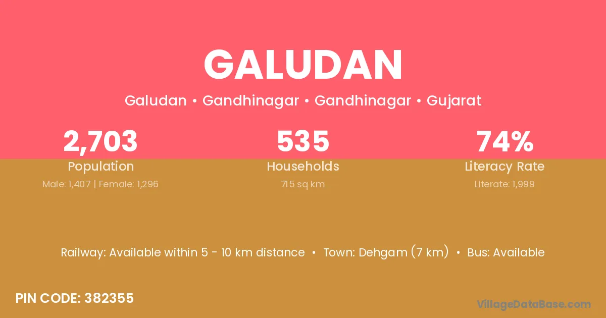 Dehgam (7 km) is the nearest town to Galudan village for major economic activities and is located approximately 7 km away.