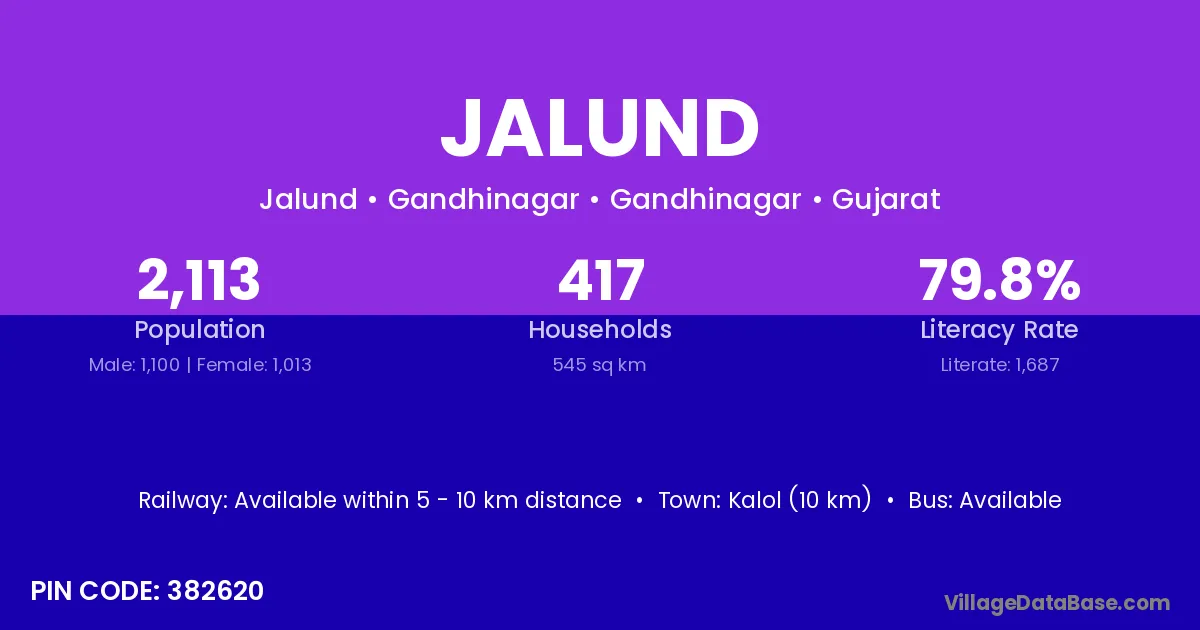 Kalol (10 km) is the nearest town to Jalund village for major economic activities and is located approximately 10 km away.