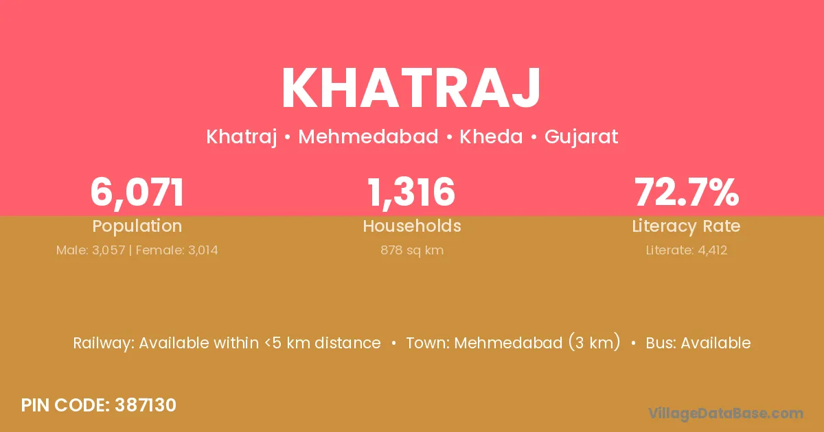 Kalol (12 km) is the nearest town to Khatraj village for major economic activities and is located approximately 12 km away.