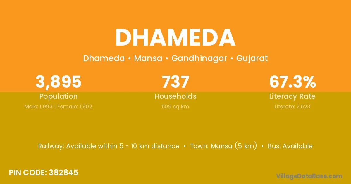 Dhameda village has a total population of 3,895 people, of which 1,993 are males and 1,902 are females.
