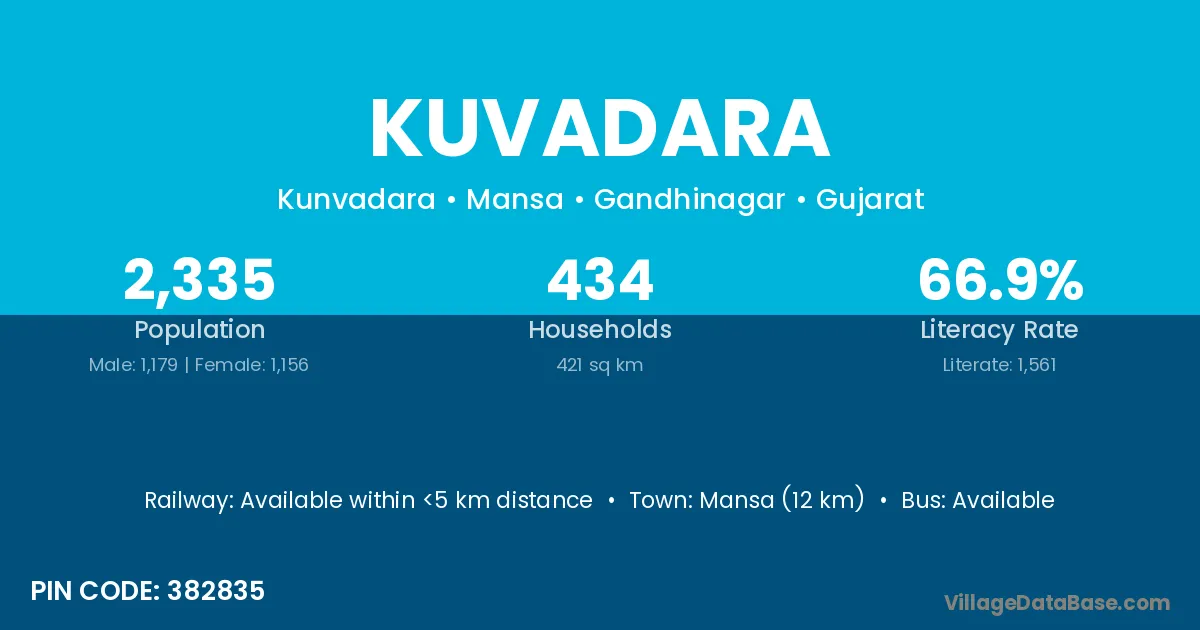Mansa (12 km) is the nearest town to Kuvadara village for major economic activities and is located approximately 12 km away.