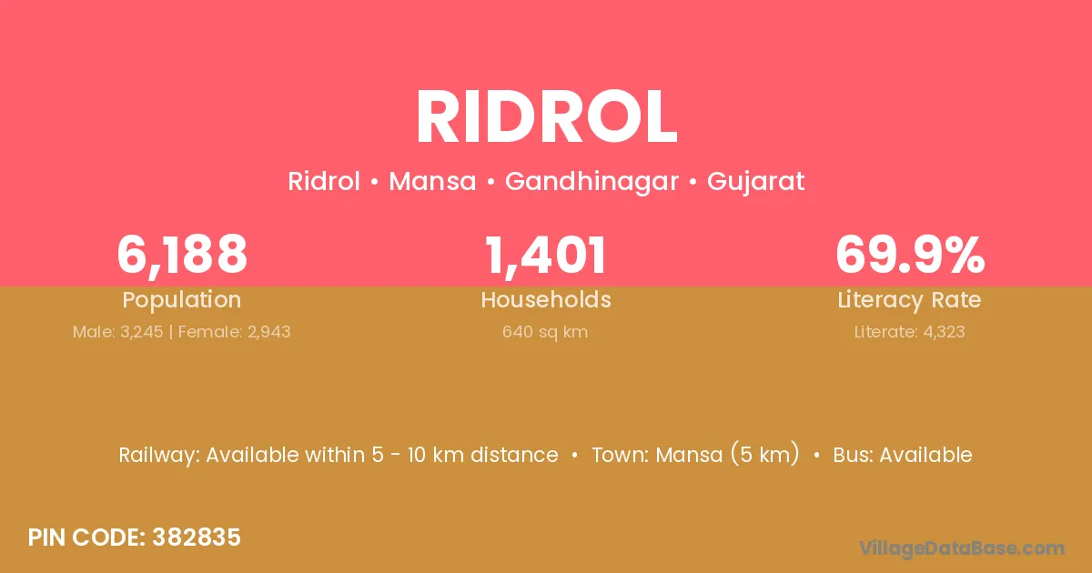 According to Census 2011 information, the village code of Ridrol village is 382835.