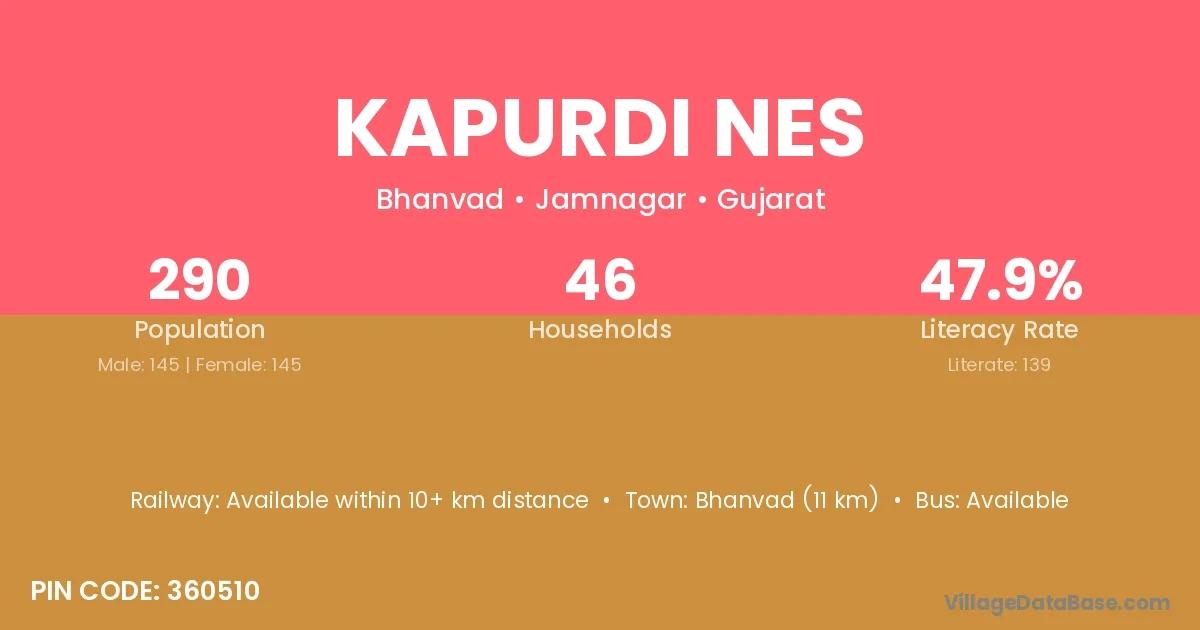 Kapurdi Nes village has a total population of 290 people, of which 145 are males and 145 are females.