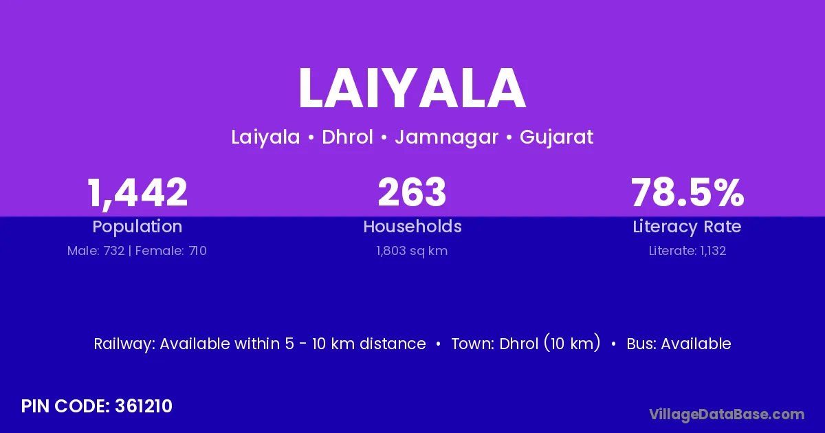 Dhrol (10 km) is the nearest town to Laiyala village for major economic activities and is located approximately 10 km away.