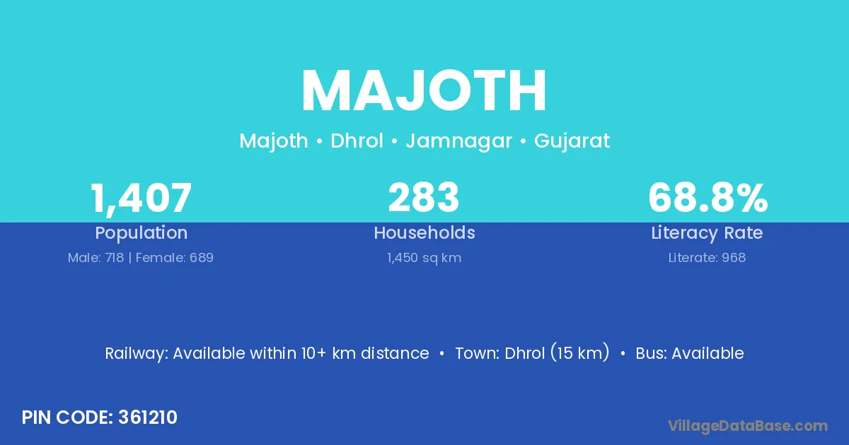 Dhrol (15 km) is the nearest town to Majoth village for major economic activities and is located approximately 15 km away.