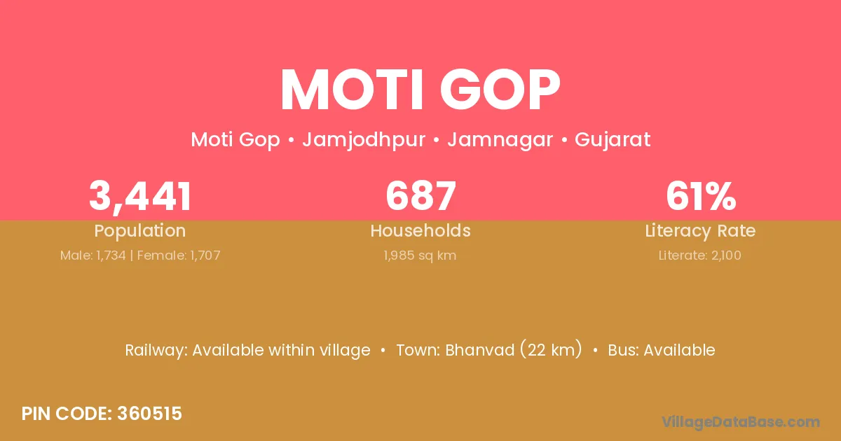 Bhanvad (22 km) is the nearest town to Moti Gop village for major economic activities and is located approximately 22 km away.