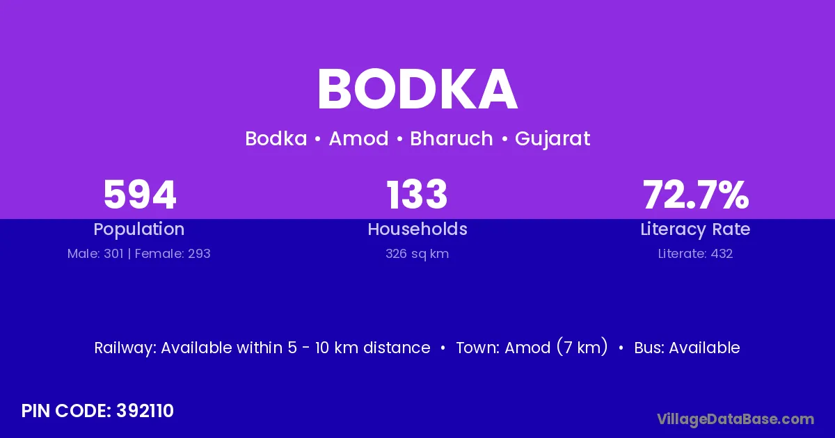 Morvi (40 km) is the nearest town to Bodka village for major economic activities and is located approximately 40 km away.
