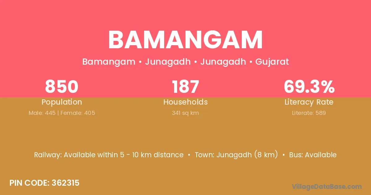 Kalavad (20 km) is the nearest town to Bamangam village for major economic activities and is located approximately 20 km away.