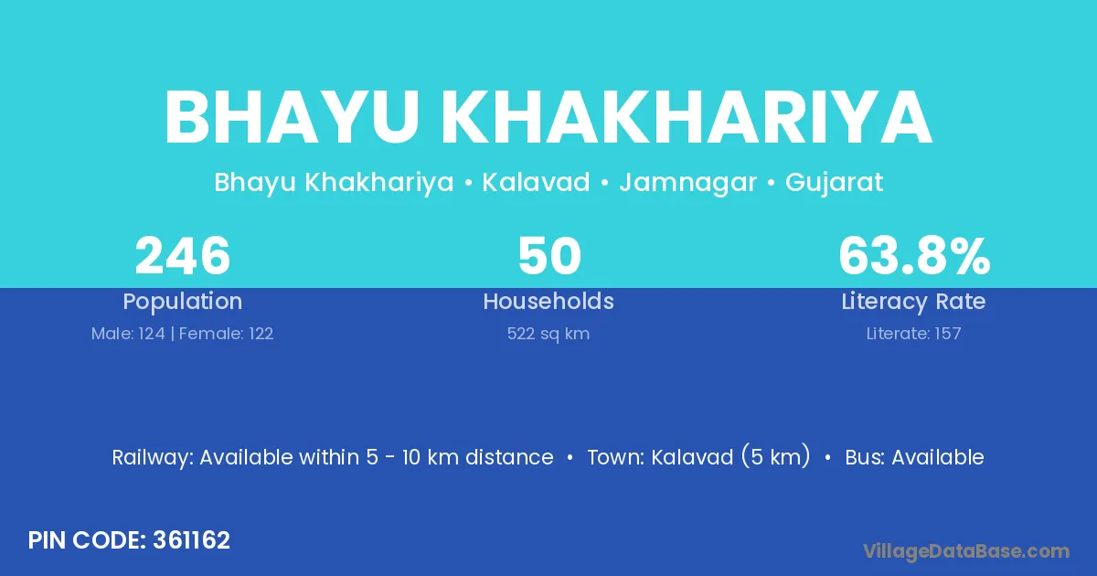 Kalavad (5 km) is the nearest town to Bhayu Khakhariya village for major economic activities and is located approximately 5 km away.