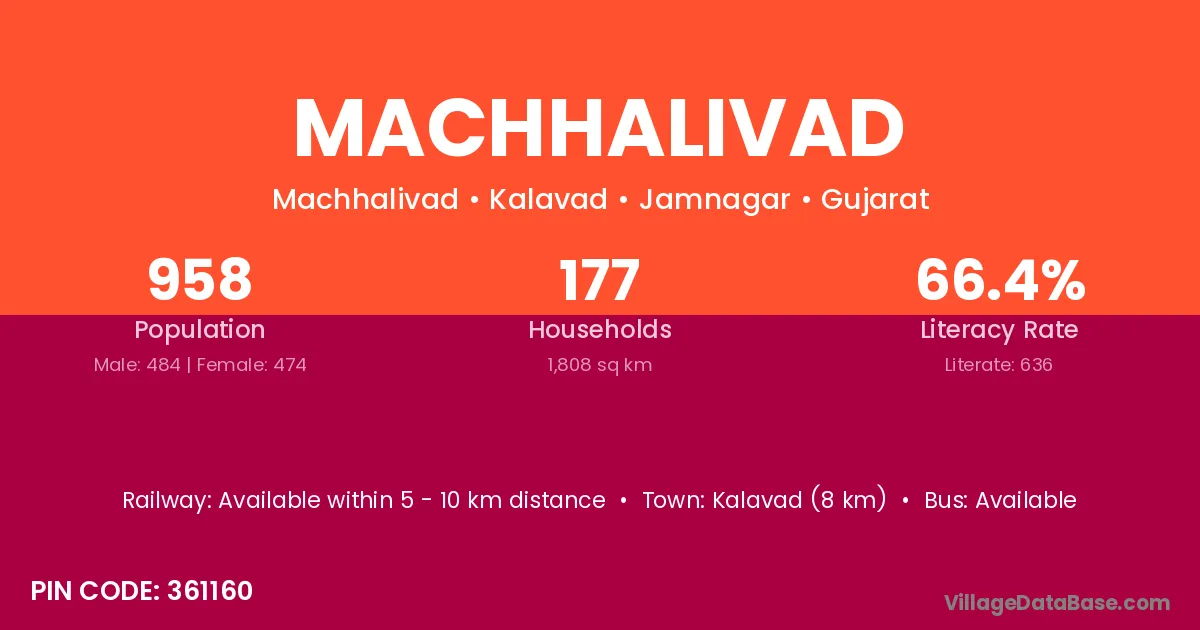 Kalavad (8 km) is the nearest town to Machhalivad village for major economic activities and is located approximately 8 km away.