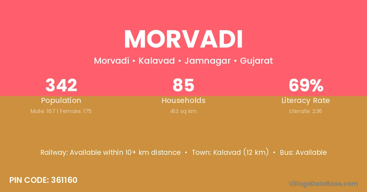 Kalavad (12 km) is the nearest town to Morvadi village for major economic activities and is located approximately 12 km away.