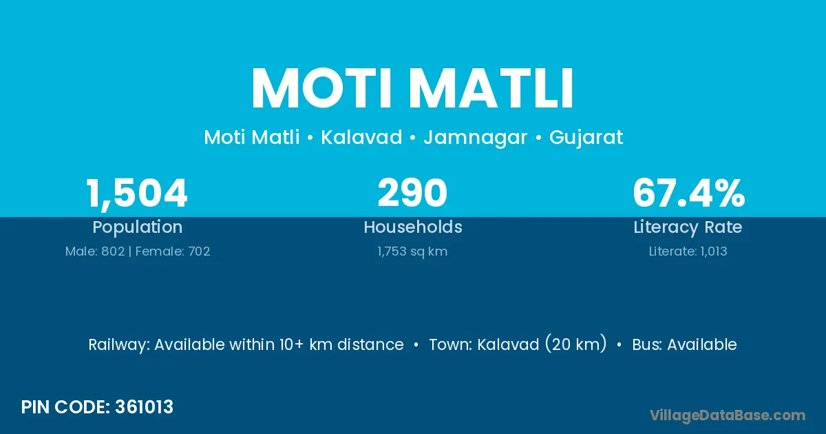 Kalavad (20 km) is the nearest town to Moti Matli village for major economic activities and is located approximately 20 km away.
