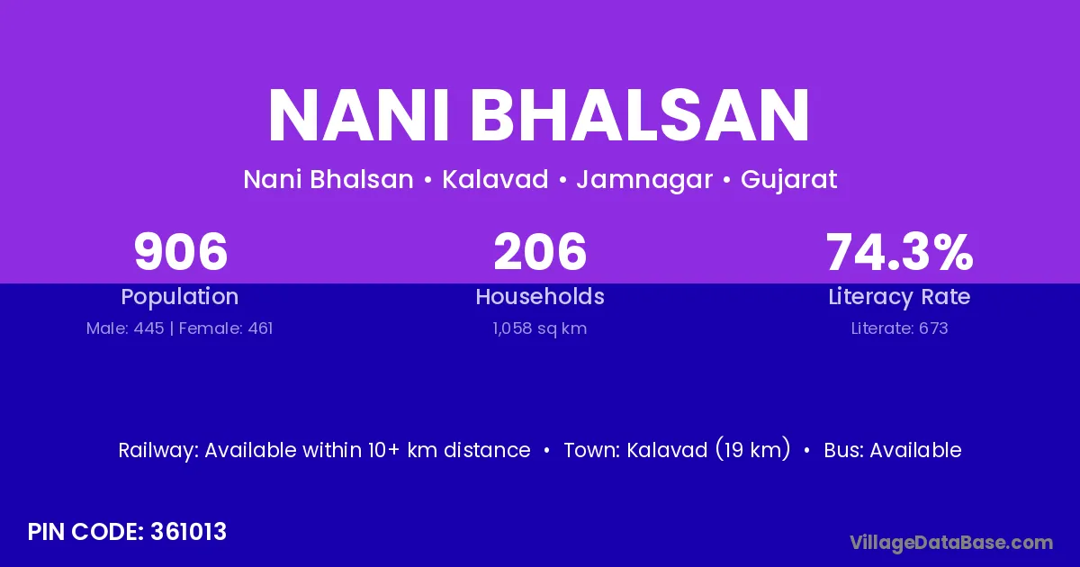 Kalavad (19 km) is the nearest town to Nani Bhalsan village for major economic activities and is located approximately 19 km away.