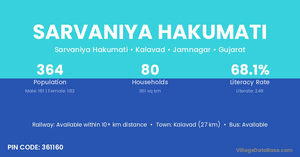 Kalavad (27 km) is the nearest town to Sarvaniya Hakumati village for major economic activities and is located approximately 27 km away.