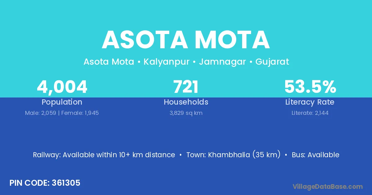 Khambhalia (35 km) is the nearest town to Asota Mota village for major economic activities and is located approximately 35 km away.