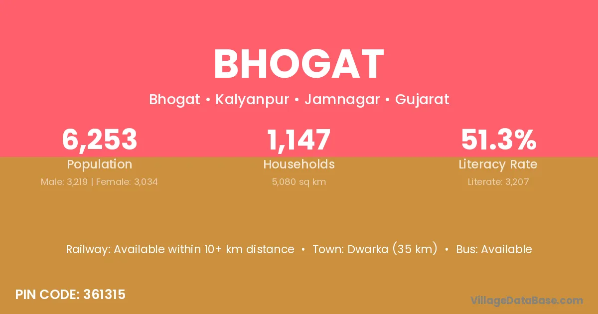 Dwarka (35 km) is the nearest town to Bhogat village for major economic activities and is located approximately 35 km away.
