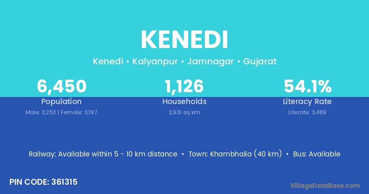 Khambhalia (40 km) is the nearest town to Kenedi village for major economic activities and is located approximately 40 km away.