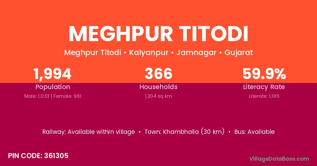 Khambhalia (30 km) is the nearest town to Meghpur Titodi village for major economic activities and is located approximately 30 km away.