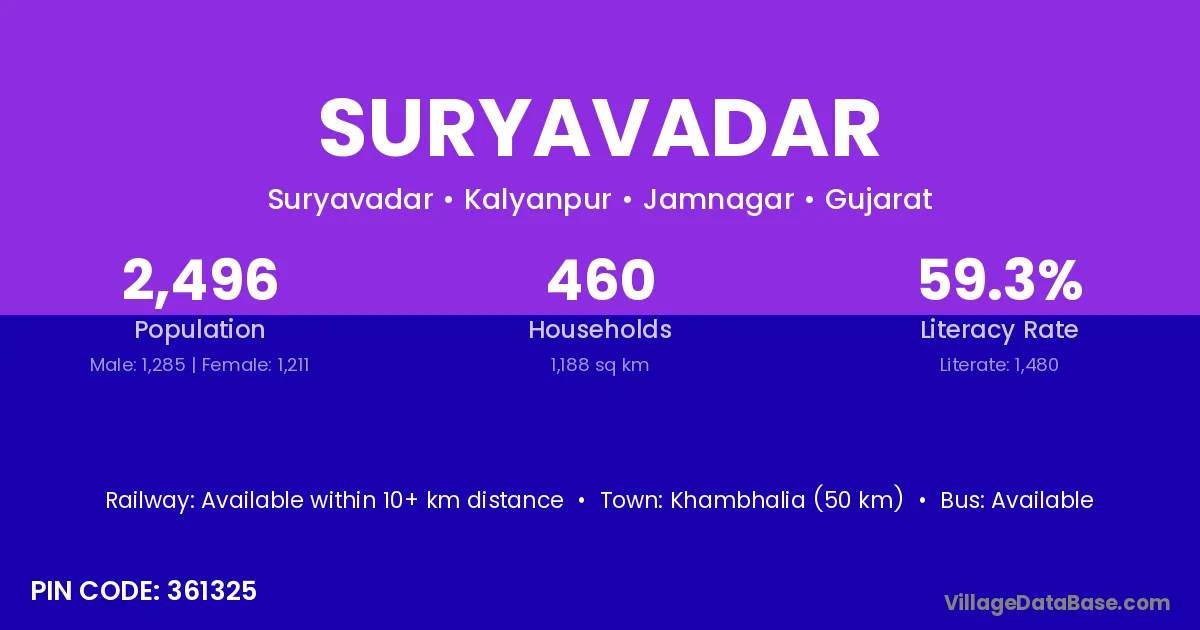 Khambhalia (50 km) is the nearest town to Suryavadar village for major economic activities and is located approximately 50 km away.