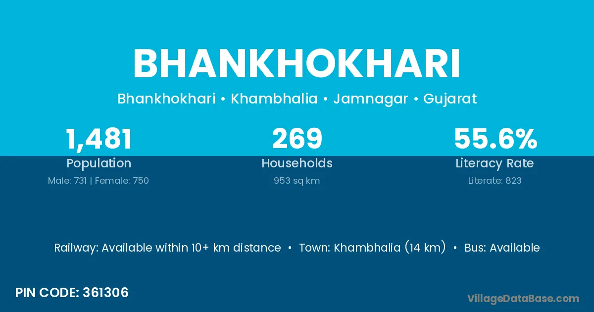 Khambhalia (14 km) is the nearest town to Bhankhokhari village for major economic activities and is located approximately 14 km away.